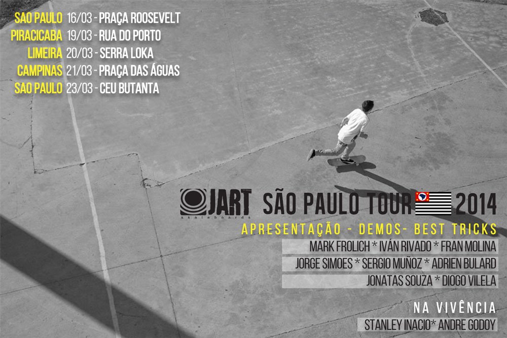 Está confirmada a Tour da JART em São Paulo. Os atletas Mark Frölick (Alemanha), Iván Rivado (Espanha), Fran Molina (Espanha), Jorge Simoes (Portugal), Sergio Muñoz (Espanha) e Adrien Bulard (França) vão descobrir o que é andar em pedrinhas portuguesas e bordas nem sempre perfeitas. A tour passará por algumas cidades do interior paulista como Piracicaba, Limeira, Campinas e na capital. Quem quiser ver os gringos basta comparecer nos dias indicados pois vai rolar demos, best tricks e rolê com os locais.